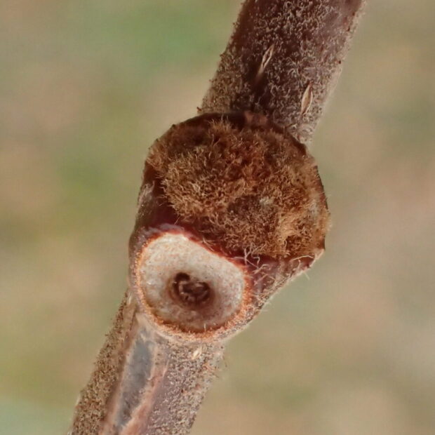 赤茶色のつる状の枝からポッコリと飛び出したところに、 ポチッと小さな冬芽と、 丸くくぼんだ葉痕があります。