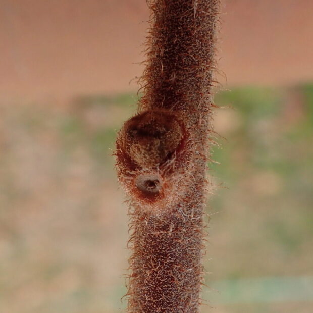 新しいツルは褐色の毛でおおわれています。 数年たつと木質化した太いツルになります。