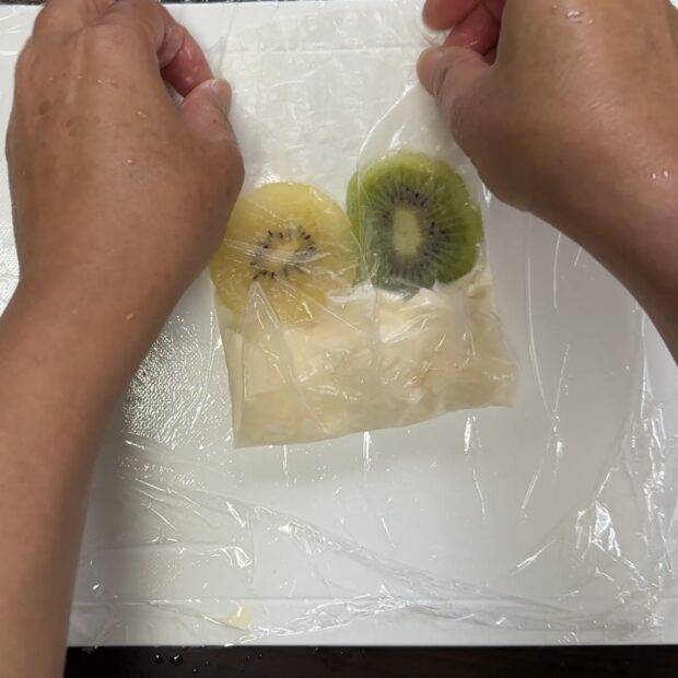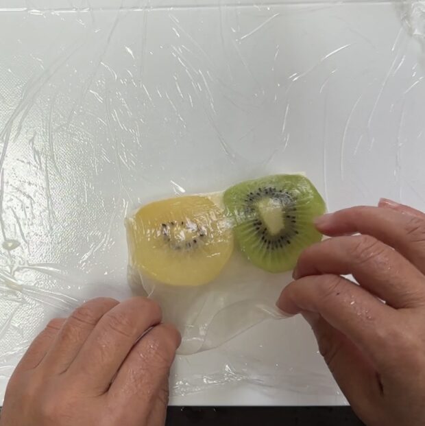 ライスペーパーでアイスとキウイをくるんだ簡単なおやつ。 もちもちひんやりおいしいですが、 急いで作らないとアイスが溶けちゃいます。 作ったものをラップでくるみ、 急速冷凍すると後でゆっくり食べられます。