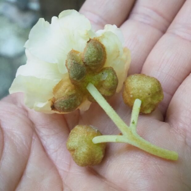 初夏、 クリーム色の花が咲きます。 雄花と雌花が別々の木に咲きます。 雌花にはたくさんのめしべがあります。 雄花には退化しためしべがあるため、 雌花と雄花は似ています。 雄の花は咲き終わると落ちます。