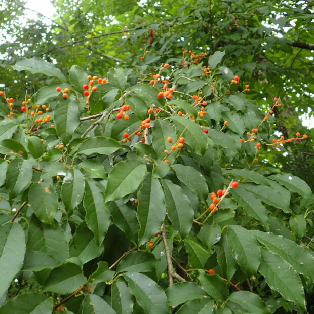 7~9月に黄色から赤へ、 赤から黒紫色へ色が変わる丸い実をつけます。 食べると苦味が強い実です。