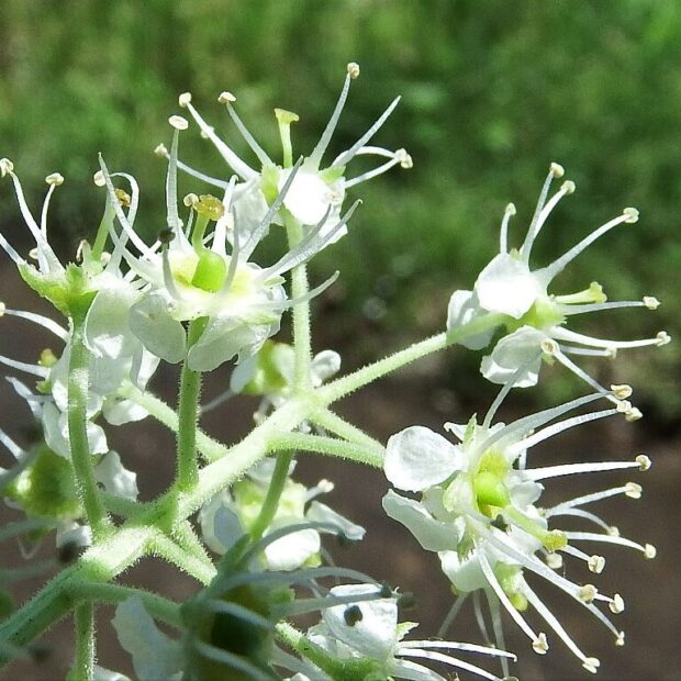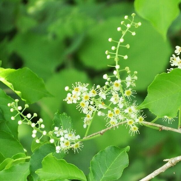 4~5月、 葉が出た後に白色のちっちゃな花がブラシ状に集まって咲きます。 切れ込みのない丸い花びらは5枚で、 雄しべは長く外に突き出ます。