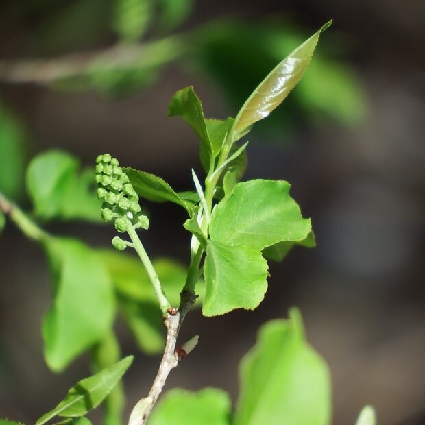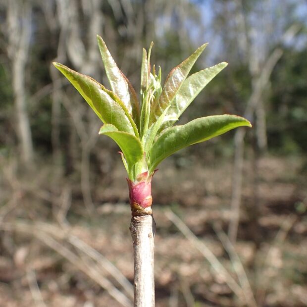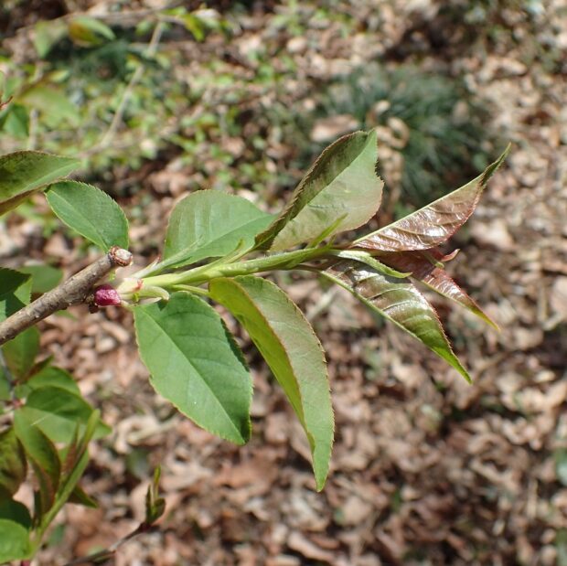 とがった卵形をした赤くきれいな冬芽を付けます。