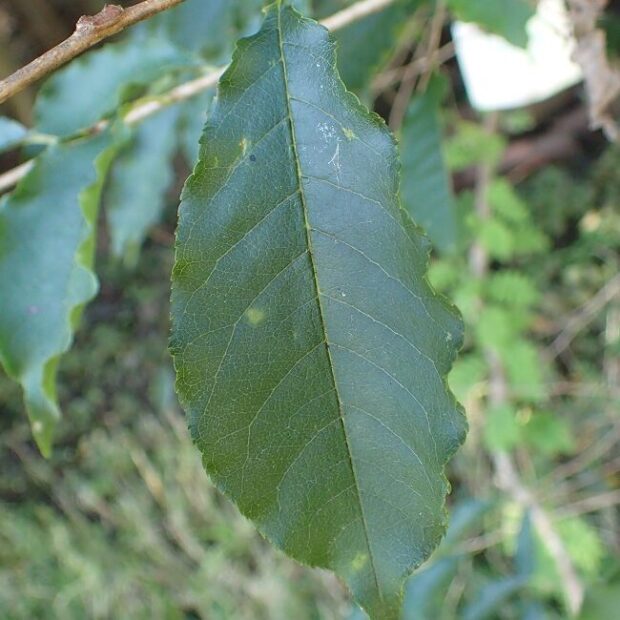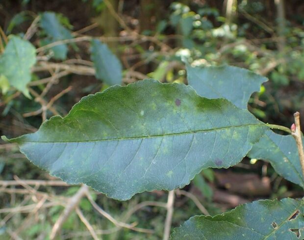 互生で、 葉は互い違いにつきます。 細長く、 ギザギザの先は丸いくなりやすい葉っぱです。 葉の先はしっぽのように長くなります。 もむと青くさい匂いがします。