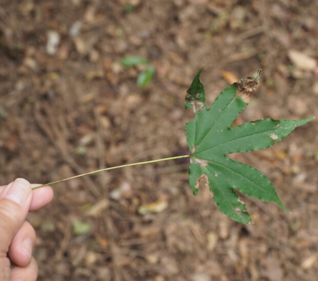 ギザギザが無く対生のカエデの葉なので見分けやすいです。 大き目の葉が多く、 5つ以上に浅くさけるものが多いです。
