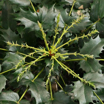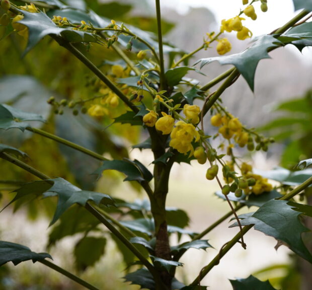 ナンテンの仲間で、 葉の縁にヒイラギのようなトゲがあることから、 ヒイラギナンテンと名付けられました。