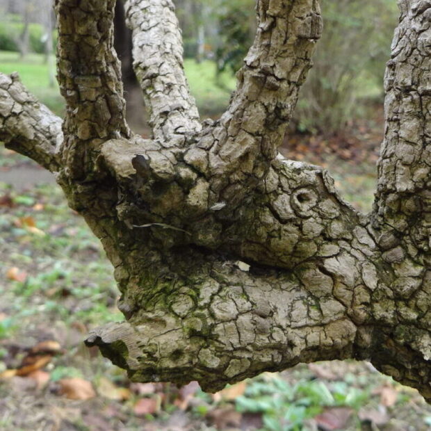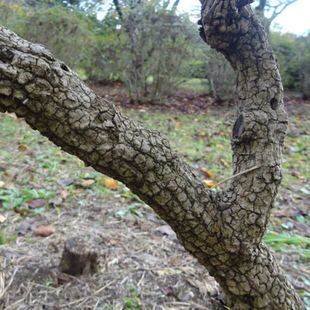 灰色がかった幹で、 縦横にさけ目が入ってコルク質の樹皮になりゴツゴツします。