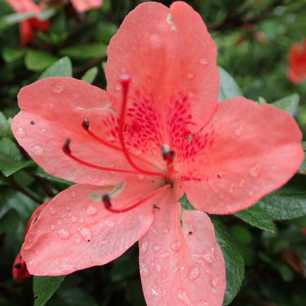 5~6月ごろに朱色やピンク色の花をたくさん咲かせます。 花びらは真ん中ぐらいから5つに分かれ、 ラッパのような形をしています。 上の方の花びらには濃い色のはん点があります。 ツツジの仲間では最も遅く咲き、 開花期間は長めです。