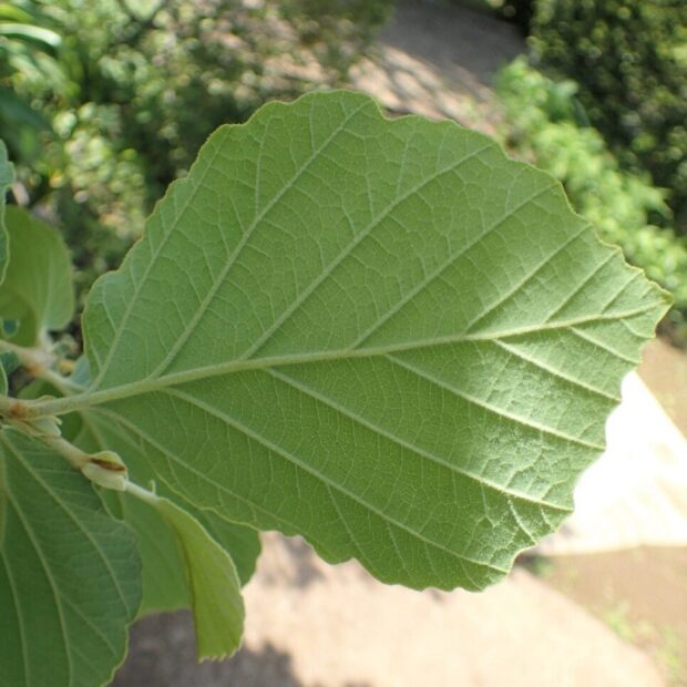 丸みのあるひし形や平行四辺形のゆがんだ形をした、 ちょっと個性的な葉っぱです。 波状のギザギザもチャームポイントです。