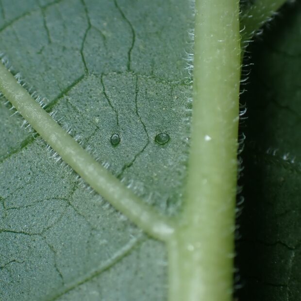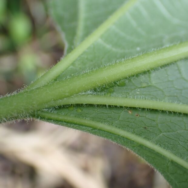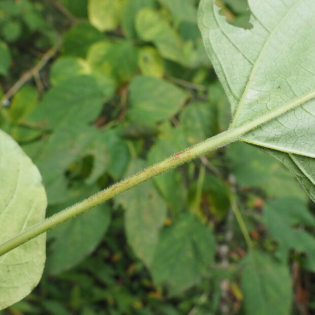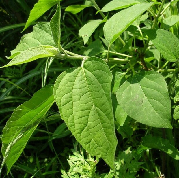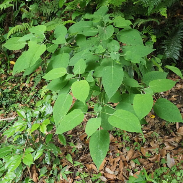 広い卵型や三角に近いハート型の葉っぱを付けます。