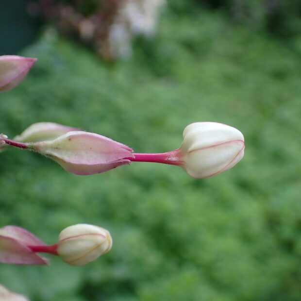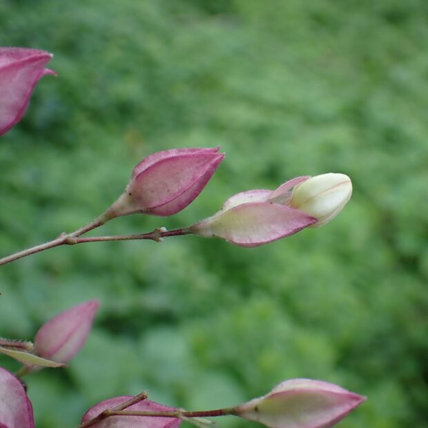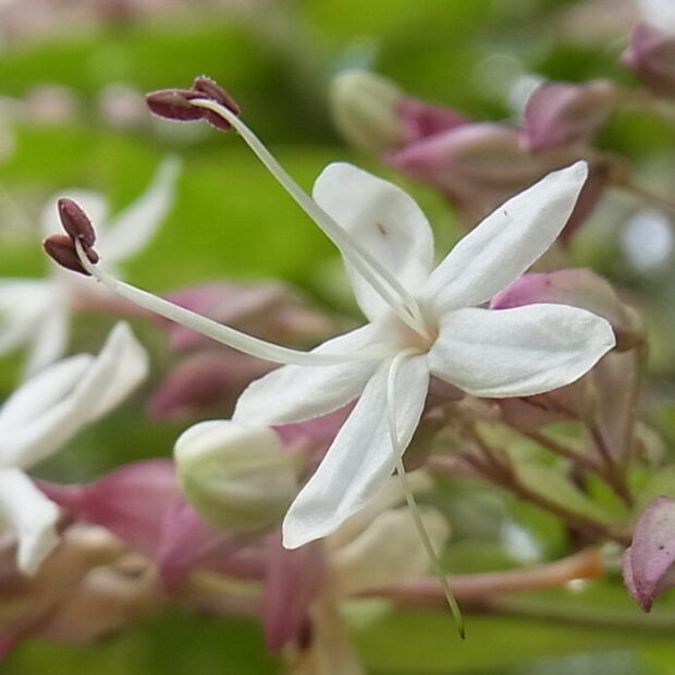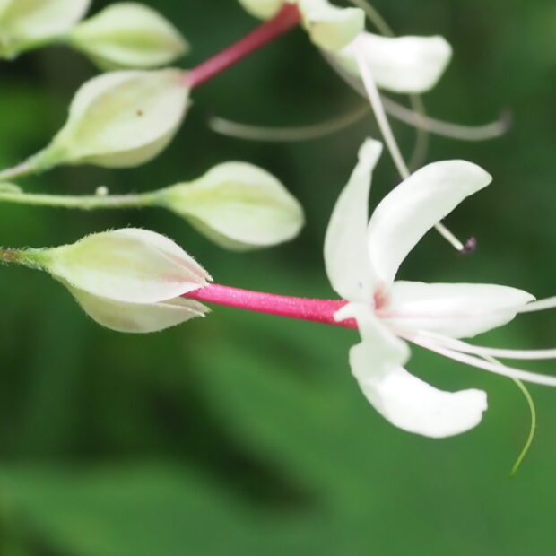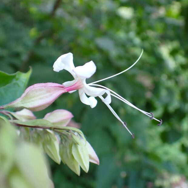 甘い香りにさそわれて、 アゲハチョウの仲間やガなど、 長い口吻の昆虫が訪れます。 花は雄しべ、 雌しべは長く突き出し、 虫に花粉を運んでもらいます。
