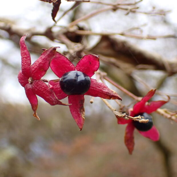 花が散った後に「がく」が赤くなって星状に開き、 真ん中に実が付きます。
