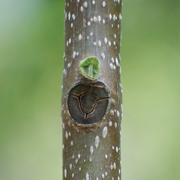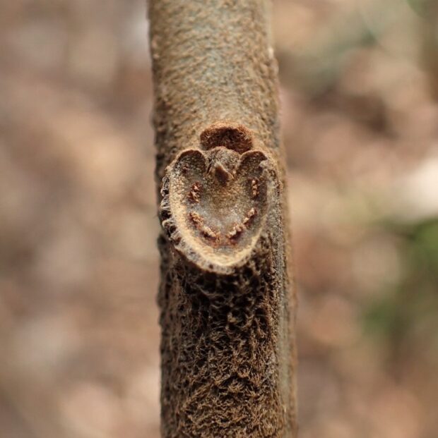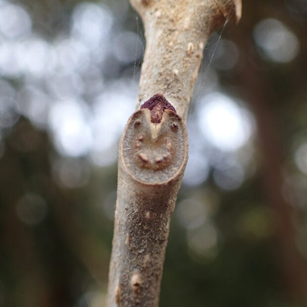 黒や紫がかった茶色の毛でおおわれ、 温かそうな冬芽です。 枝の先に付く芽は円すい形で、 側芽は半球形または卵形をしています。 葉が付いていた後の形はだ円形からハート型をしています。