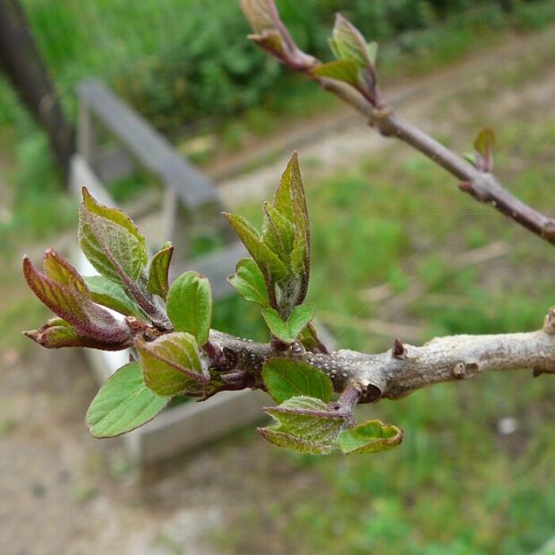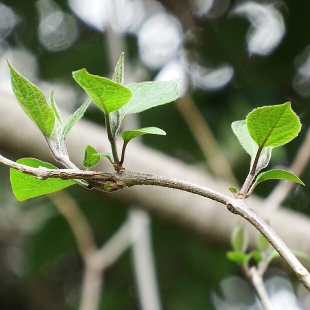 幹は灰色~こい灰色で丸い皮目が多く、 年を取ると縦にさけ目が出来ます。 若い枝は茶色や白色のやわらかい毛でおおわれ、 灰色がかった茶色~淡い赤紫色です。