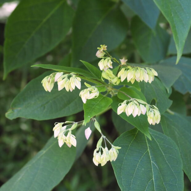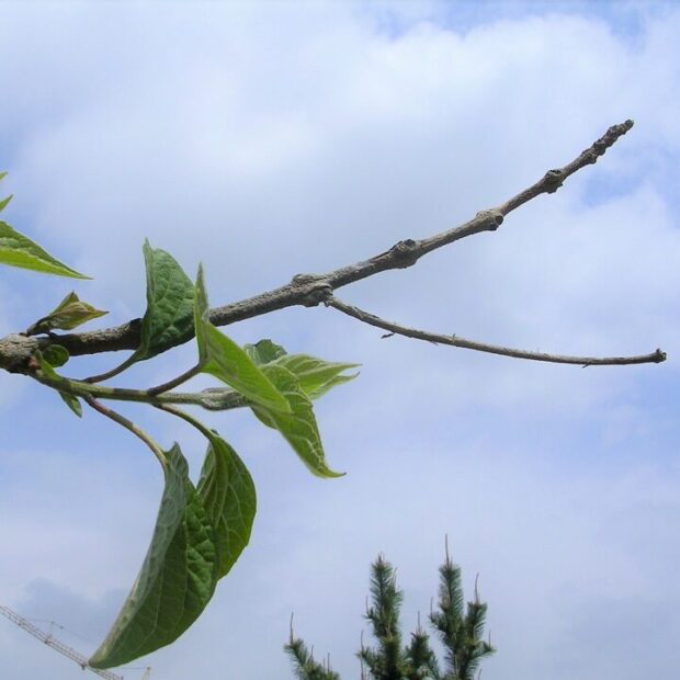 高さ2~8mの落葉樹です。 幹はシュッとしてスリムです。 枝の先の方に大き目の葉をたくさん垂らして重そうに見えます。