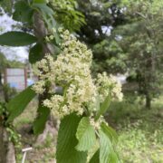 ガマズミに近い仲間で日本にだけ自然に生えている日本固有種の木です。 葉をもむとゴマ油の香りがします。 春に白くて小さな花をたくさん付けて、 夏にみのる赤い実はとても目立ちます。