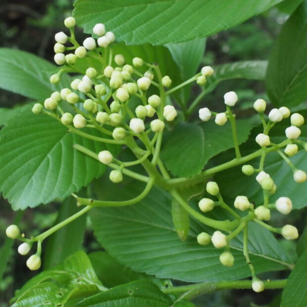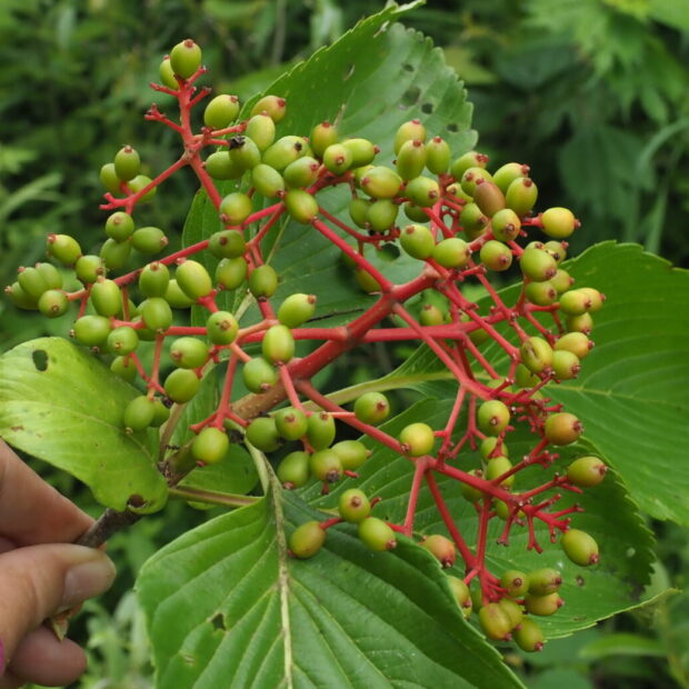 ガマズミに近い仲間で日本にだけ自然に生えている日本固有種の木です。 葉をもむとゴマ油の香りがします。 春に白くて小さな花をたくさん付けて、 夏にみのる赤い実はとても目立ちます。