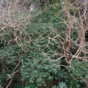 葉が付くくきや若い枝は赤みがあります。 老木になると樹皮は縦長にさけて、 はがれることもあります。
