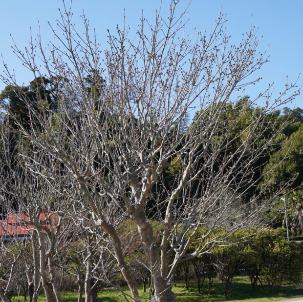 花びらが無く、 茶色くて地味です。 おしべだけが付く木と、 めしべと仮おしべ(おしべっぽいもの)が付く木があます。