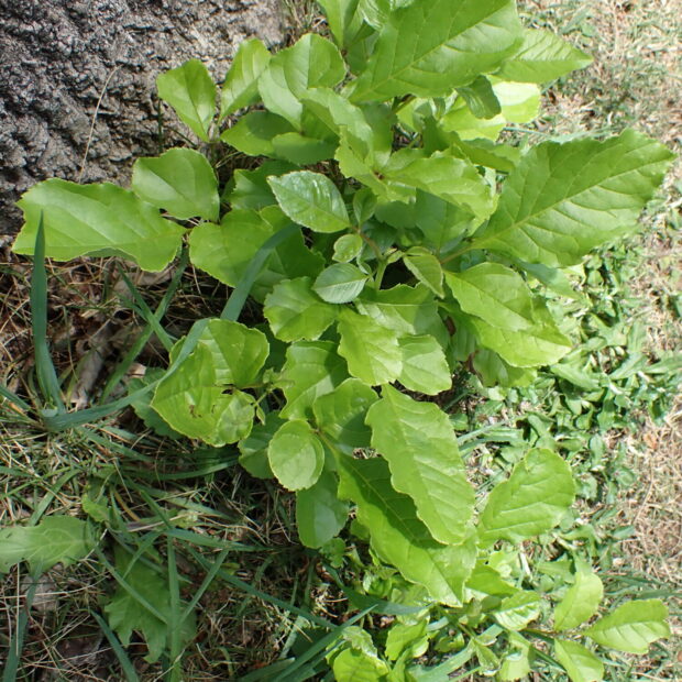 葉っぱがなんというか、 形がバラバラと言いますか、 大雑っぱな作りで、 あまり几帳面さは感じられません。 花も花びらはなく、 咲いていても茶色のかたまりです。