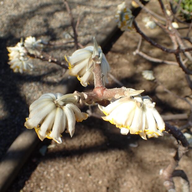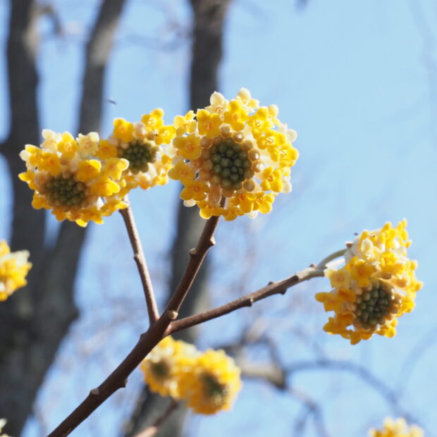 木の皮が丈夫で、 室町時代ころから和紙の原料植物として使われ、 今も日本紙幣の原料になっています。 その他にも地図、 証券、 ハガキの原料などに利用されています。 早春に咲くボンボンの形をした花も可愛らしく、 庭や公園によく植えられます。