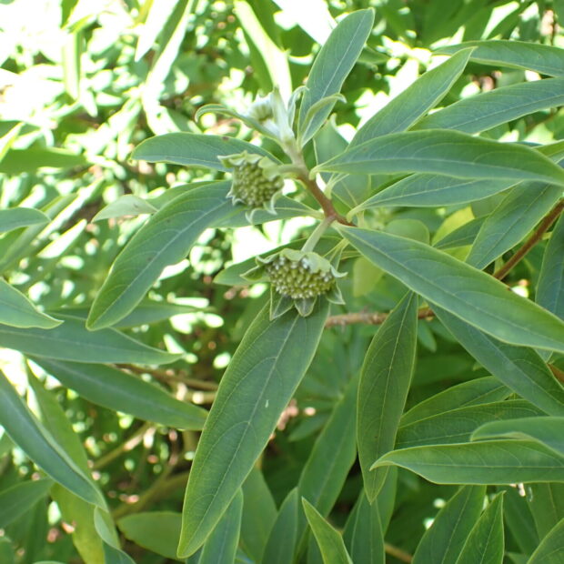角の様な葉芽と銀色の毛に被われハチの巣の様な花芽を付けます。
