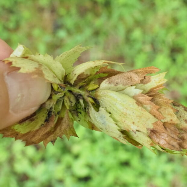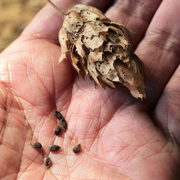 大きな実に見えるものは、 天狗のうちわのような形をした小さな葉のようなもので守られた小さい実が、 縦に連なって付いたものです。 遠くから見るとビールのホップとよく似ており、 ボリュームがあって目立ちます。 10月頃に茶色に熟し、 羽付きの実が一つずつ風に飛ばされて種まきされます。