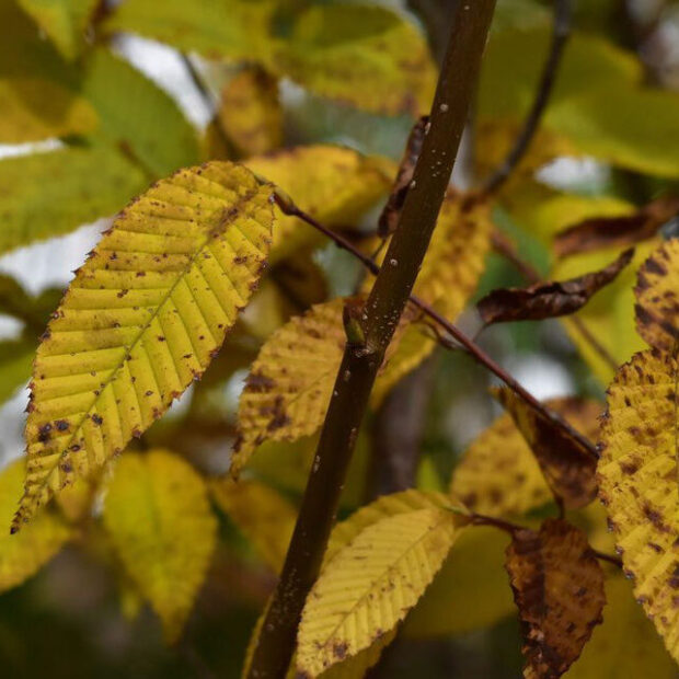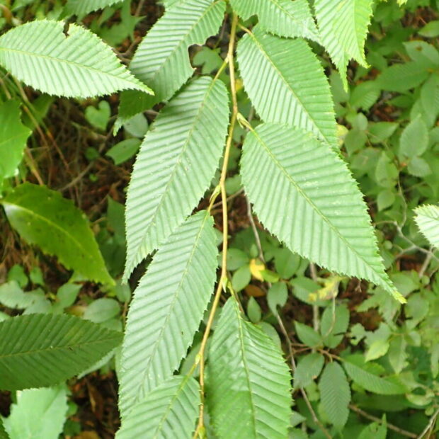 葉の側脈は20~24対もあり、 これでもか!と言わんばかりに、 きっちりと平行に脈が刻まれています。 シデの仲間の中でも細長くて大きな葉です。