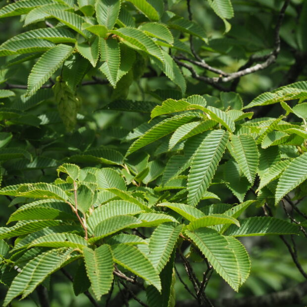 クマシデはクマのように大ぶりな葉と実を付けるためクマシデと呼ばれます。 太くて大きな果苞(かほう : 羽がついた実の集まり)が鈴なりぶら下がる様子はとても目立ちます。 日本固有種です。
