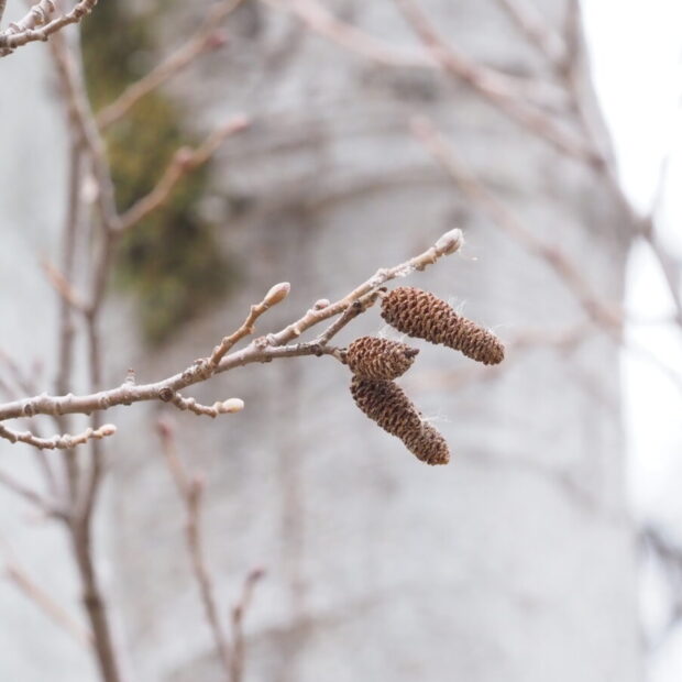 ハンノキの仲間は根っこで放線菌(ほうせんきん)という微生物と共生していて、 葉っぱなど体を作る時に必要なチッソをもらえるので、 かなり強気です。 葉を落とす前に紅葉(黄葉)する木は葉の葉緑素を分解してリサイクルする結果、 葉が色づくのですが、 この木はその必要がないためか、 緑のまま葉を落とします。 また、 他の木より葉を使う期間が短く、 どんどん新しい葉をつけて使い、 捨てていきます。 結構浪費家?の可能性ありです。 共生する微生物のおかげで、 生長が早くタフな木です。