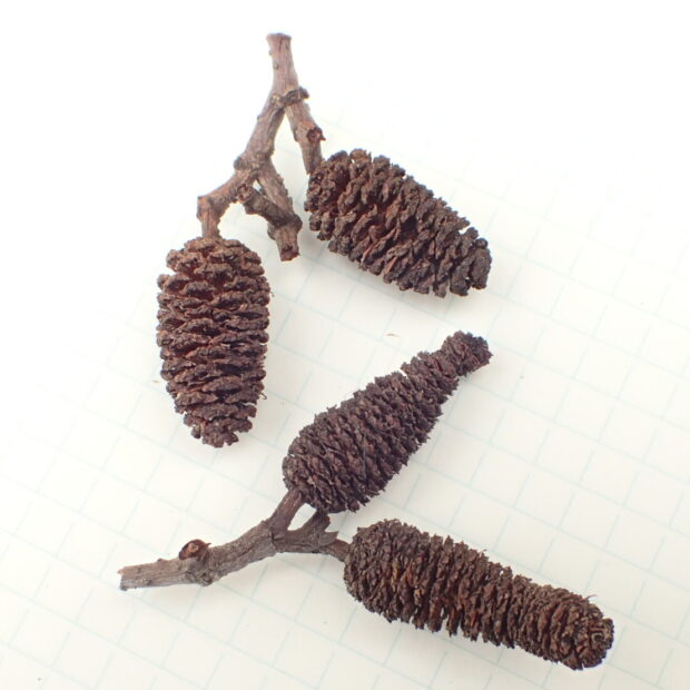 ちょっと細長く、 ちっちゃいマツボックリのような形です。 10月ごろに熟し、 緑からこげ茶色になります。 冬、 短い枝とともに落ちるものもありますが、 いつまでも残り、 ついているものもあります。