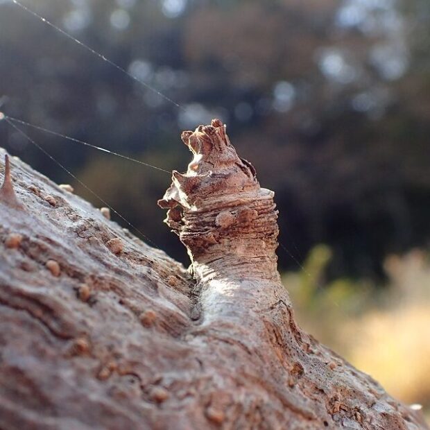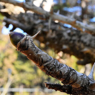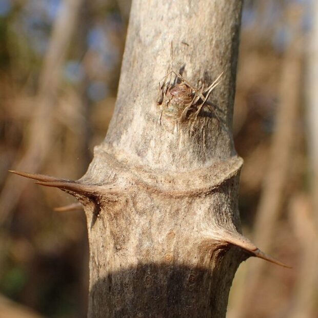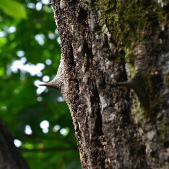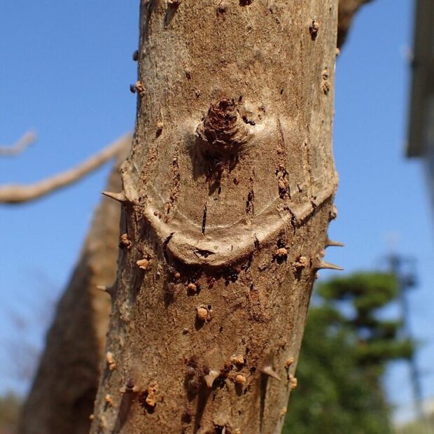 若い幹や枝にトゲがあります。 幹のトゲは次第に消えていき、 その代わり樹皮は縦に深くさけて縦長の網目模様を作ります。
