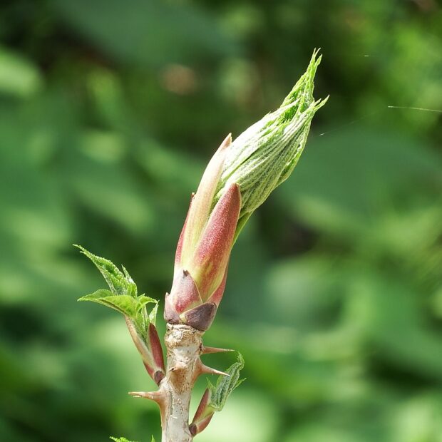 痛そうなトゲトゲの枝や幹が第一印象となる木ですが、 線香花火が思い浮かぶような花や実を付け、 可愛らしい一面もある木です。 北から南まで広い地域で生きていける強い木でもあります。