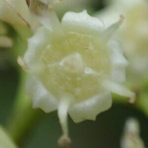 枝の先の方に、 緑ががかった白色のちっちゃな花が集まって付きます。 花びらは、 おしべを両側から包み込み、 やがて反り返ります。