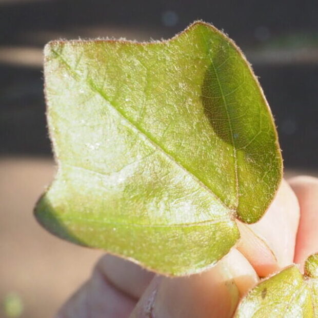 小型の葉っぱで、 先が浅く三つにさけます。 革のような質感で、 夏は全体的に濃い緑色となり、 秋は真っ赤に紅葉します。