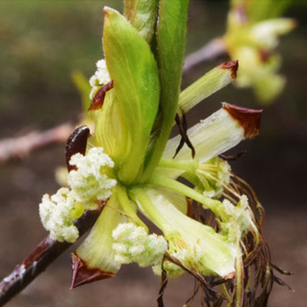 春、 紅い雄しべが出た後、 白っぽい雌しべができます。 原始的な花で花びらも萼もありません。