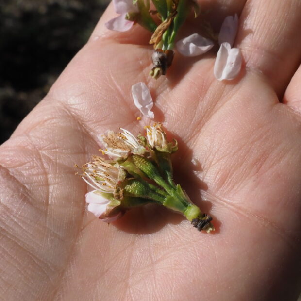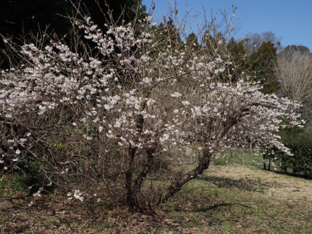 中国原産のシナミザクラと日本原産のコヒガンから生まれた園芸品種です。 早春の関東ではお彼岸の前に小ぶりの花をたくさん付けて見栄えが良いので、 切り枝としてお花屋さんで売られています。