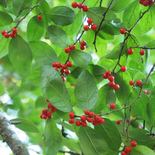 赤い実を食べに、 メジロ、 ヒヨドリ、 オナガ、 ジョウビタキなどの野鳥がやって来ます。
