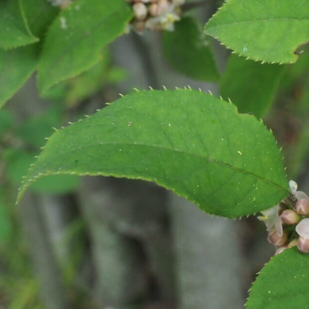 全体的にくすんだ黄緑色で卵形の葉っぱです。 両面に毛があってザラザラしています。 互生に付いてギザギザの先は毛のようになっています。