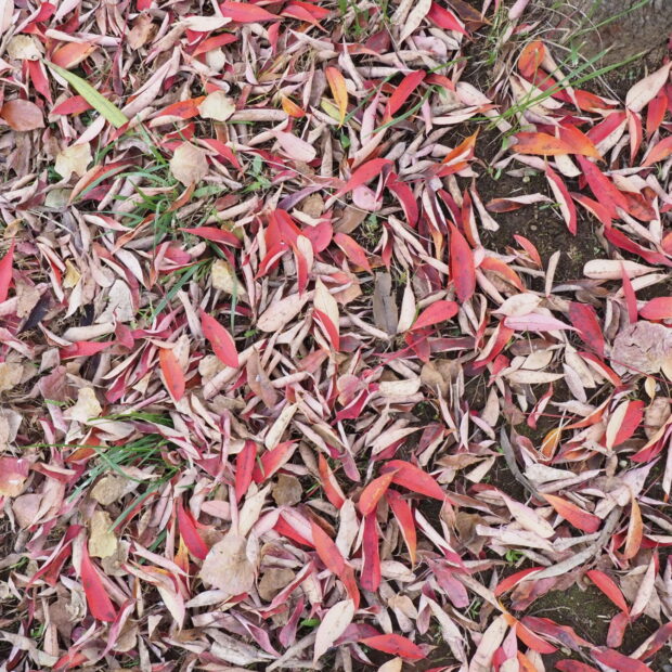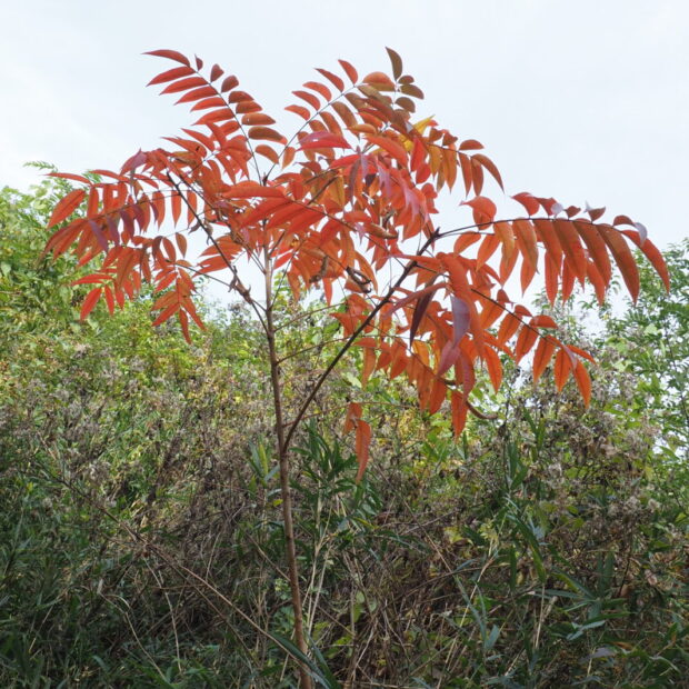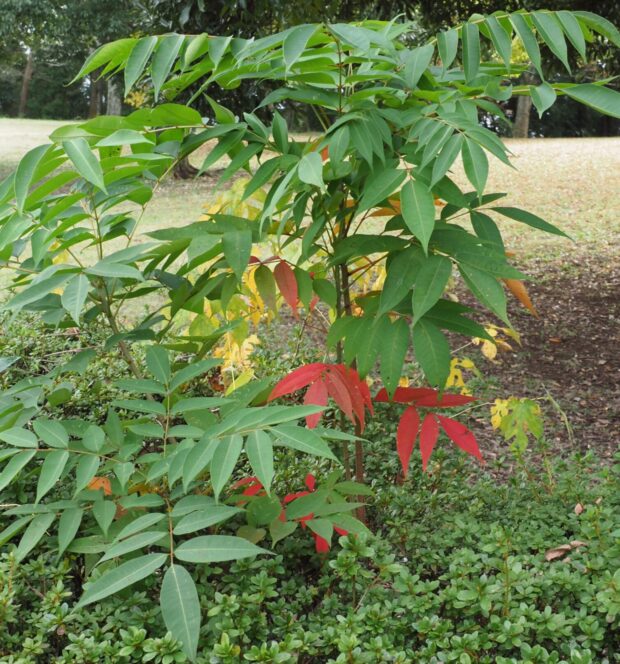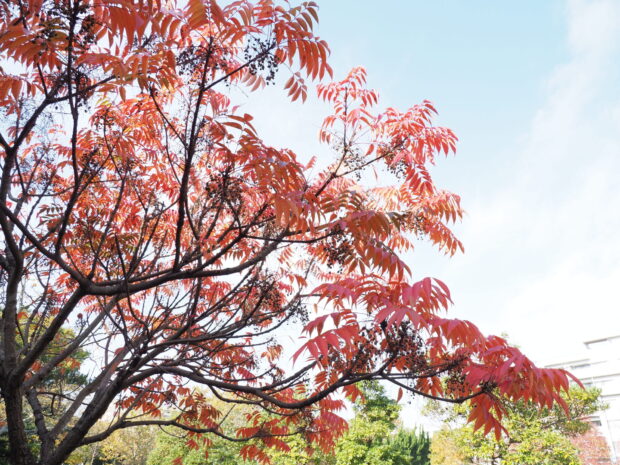 寒さに敏感で、 秋、 10℃以下の日があると、 すぐに「さむっ」っと紅葉します。 他の木より紅葉が早い印象があり、 紅葉しているハゼノキを見ると「そんなに寒いか?」と話しかけたくなります。 鮮やかな紅葉は、 地味な実を鳥に見つけてもらうための目印なのかもしれません。