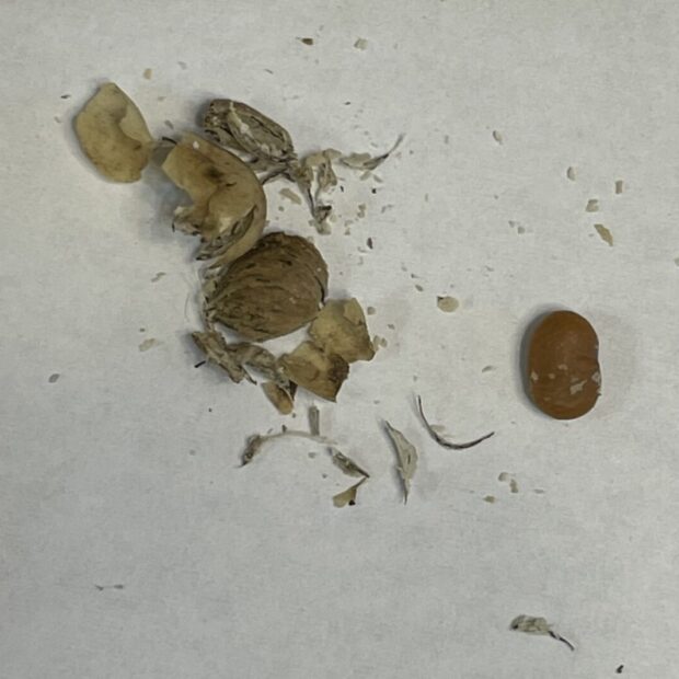 9~10月ころになると、 だ円形で1㎝ほどの実が熟して、 うす茶色になります。 和ろうそくになる部分はオレンジ色の種ではなく、 その周りに付いた皮の部分です。
