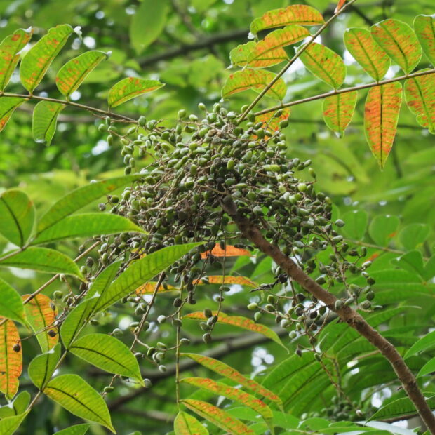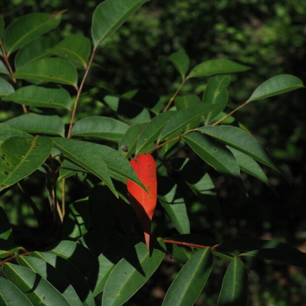 ハゼノキはウルシの仲間の中でも全体的に毛が無く、 葉っぱがよく似ているヤマハゼやヤマウルシと見分けるポイントになります。 よく観察したいところですが、 葉の白い液はかぶれる場合もあるので注意しましょう。