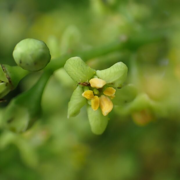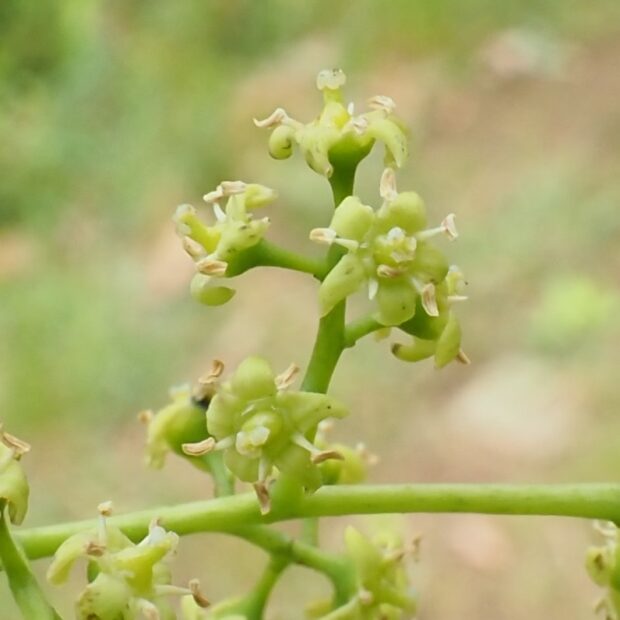 5~6月ごろ、 葉っぱの付け根に黄緑色の小さな花をたくさん咲かせます。