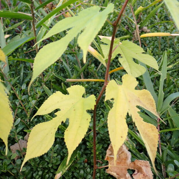 先っぽが尾っぽのように細長くなる葉っぱです。 ふつう卵形ですが、 2~5つに深くさける葉っぱもあり、 若い枝ではよくさけます。