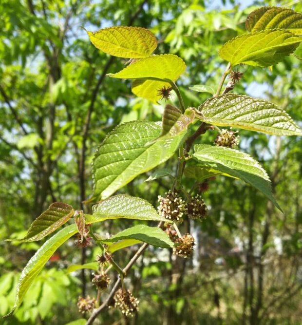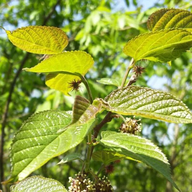 4~5月、 雄花と雌花が同じ木に咲きます。 新しい枝の葉の付け根に雄花が咲き、 その上部にホヨホヨした赤紫色の毛の様なものを生やした雌花をつけます。