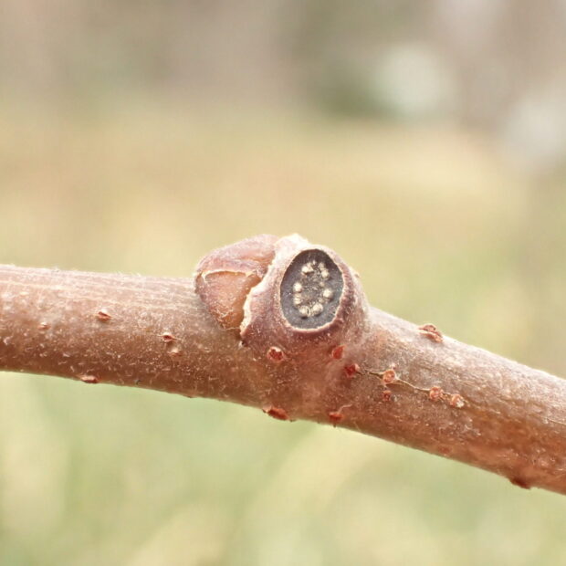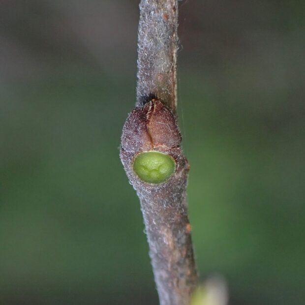 おにぎりのような形の冬芽で、 芽鱗は2枚です。 葉痕はほぼまん丸で、 維管束痕も丸く並びます。 横から見ると、 枝からかなり飛び出しているのも特徴です。