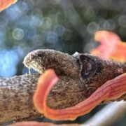 灰色がかった幹や枝で、 幹には、 やや大きめの皮目(ひもく)と呼ばれるブツブツが付きます。