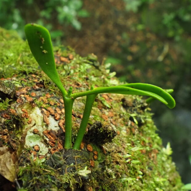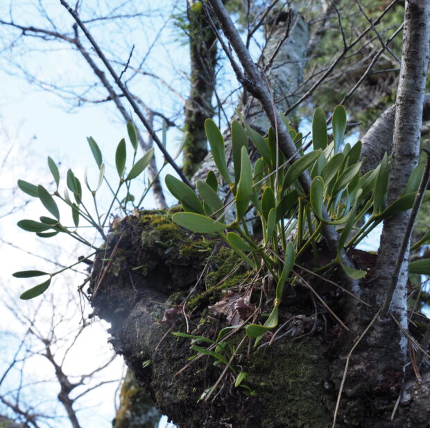 ヤドリギはねばねばした緑色の種が枝にくっついてから、 葉が開くまで3年かかるそうです。 枝の上にも3年。 なかなかの忍耐強さで、 寄生生活も割と苦労が多いようです。 とにかく木にくっつかないと生きていけないので、 実のネバネバはとんでもなく伸びるようです。