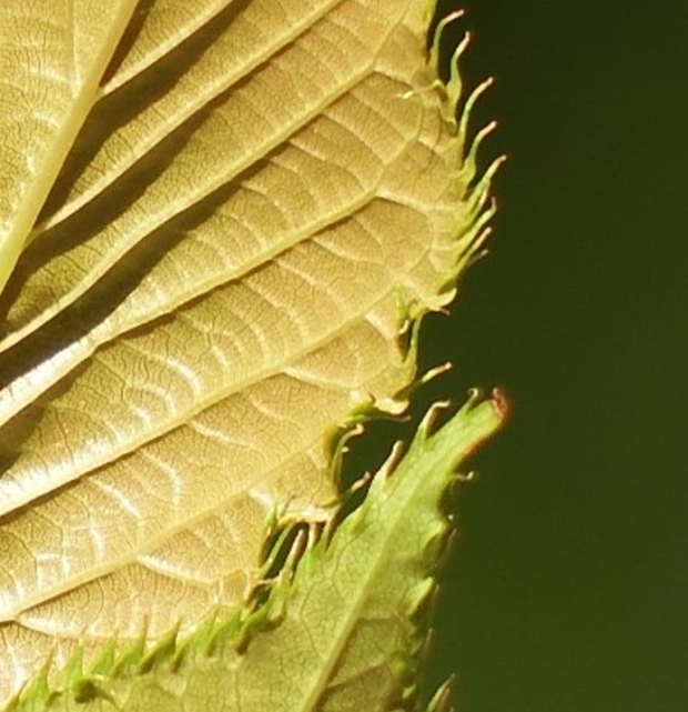 葉っぱの幅が一番広い所が真ん中より先の方になる楕円形で、 細かいギザギザがあります。 新芽は赤茶色になることが多いです。