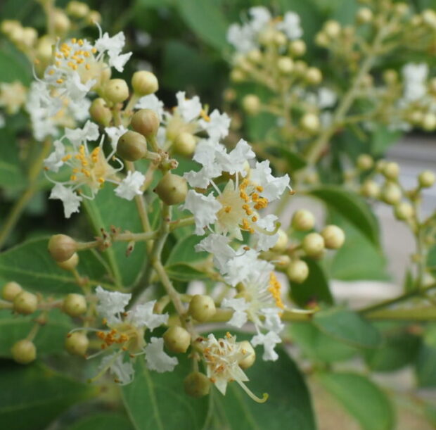 夏の初めから晩夏にかけて、 枝先にまとまって白い花を咲かせます。 サルスベリの花を小さくしたような形の花です。